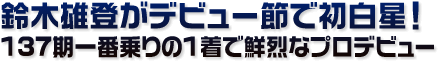 プロデビュー戦は、6号艇から枠なりの123/456でスタートが切られた。1周1マークでは、1号艇・乃村康友、5号艇・伊藤啓三をまくり差しで捉える積極的な旋回を披露。バックストレッチでは3号艇・若林樹蘭との2番手争いに持ち込む。しかし若林がアウトから鋭く攻め、鈴木は3番手へ後退。2周1マークでは伊藤に内を突かれそうになる場面もあったが、落ち着いた対応でこれをしのぎ、デビュー後初のレースは3着を飾った。